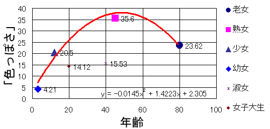 すると、生まれてそれほど時間が経っていない幼女は実に「色っぽくない」が、年を経て少女を過ぎる頃にはやがて色づいてくることがよく判る。そして、熟女となる頃には、まさに「熟した女」としか言いようがないくらい、その「色っぽさ」は最高潮に達するのである。そして、さらに年を重ねると、「色っぽさ」は薄まるが、それでも少女よりはまだまだ色っぽい、という事実が目に見える形で私たちの前に姿を現すのだ。