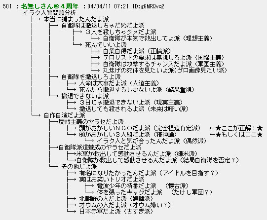 イラク人質問題分析 イラク人質問題をツリー構造で分析。(内容については別問題だと誤解無きように書いた上で)これはこれで、なかなか面白いデータマイニング。 from KLaxon - O.P. on HATENA.