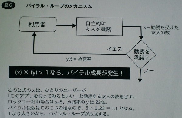 この本のタイトルにもなっている、バイラル・ループ(VIRAL LOOP)というのは、「使ったユーザが周りの人を勧誘し、さらにユーザが増える」という状態を指しています。タイトルになっているとはいえ、バイラル・ループ自体の話は、さほど興味深くも面白くもないのですが(個人的な感想です)、バイラル・ループを説明する図のひとつが制御工学のブロック線図のような具合で描かれていて、その部分には興味を感じました(解説中に出てくる閾値が0ではなく、1になっている理由は良くわかりません)。その図が下に貼り付けたものです。