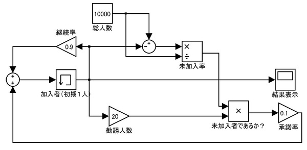 せっかく、ブロック線図っぽい解説図が描いてあるのですから、大ヒットを生み出すバイラル・ループの(シミュレーションも可能な)ブロック線図を描いてみることにしました。それが、下に張り付けた図です。たとえば、このブロック線図のモデルをSimulinkのようなソフトウェアでなぞり、そしてシミュレーションでもしてみれば、ネズミ算的にユーザ数が増大していき、限界量増えた後は停滞する、という「大ヒットから熟成期までの」の過程を再現することができるだろうと思います。