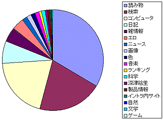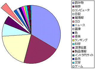 なるほど、「読み物(あぁ、なんて大雑把なくくりだ)」が三分の一を占め、以下「情報検索サイト(infoseekなど)」が1/5程を閉めている。そして、コンピュータ情報等だ。なるほど、それが「私の心の中の興味」と言われれば納得するものである。「科学」や「自然」がずいぶんと下位であるのが不思議なところであるが、まぁしょうがない。まぁ、こんなところだろう。