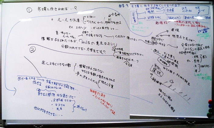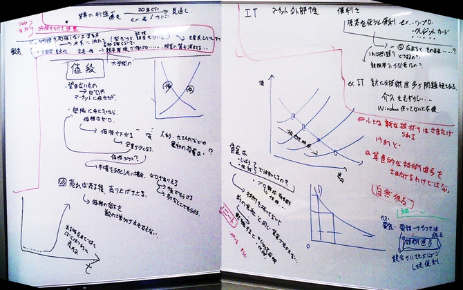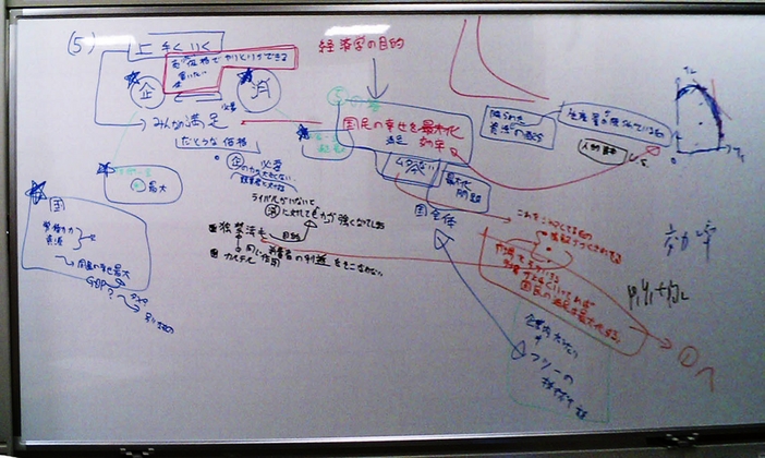 先日「経済学を勉強する」ために質問をして、質問に対する話を聞きつつホワイトボードにメモした板書です。さてさて、テープ起こししたインタビュー内容とこの板書を眺めながら、経済学の中のエンジニア? 47氏と経済学? ソーシャルブックマークと経済学? 能力給は現代の○×だ!? 「ハッカーと画家」を買うのは経済学的には何なのか?…などなど2時間分の色んな内容の中から、どの辺りの話をピックアップするかを決めてみることにしましょうか。